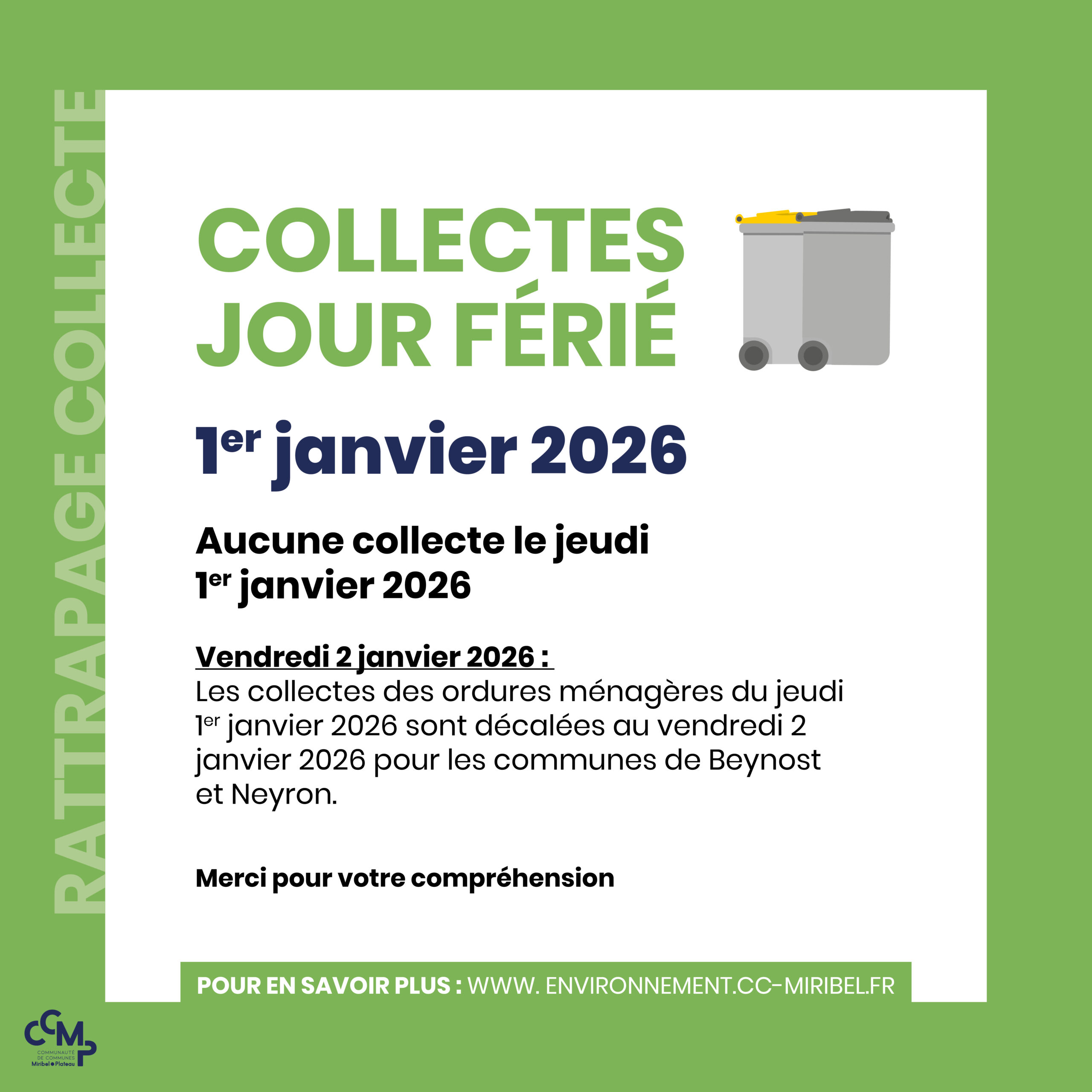 Les collectes des ordures ménagères du jeudi 1er janvier 2026 sont décalées au vendredi 2 janvier 2026 pour les communes de Beynost et Neyron.